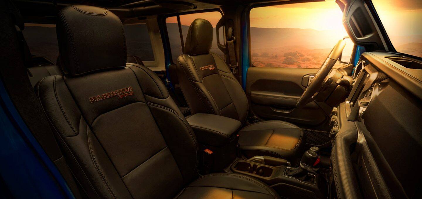 The entry-level Wrangler Sport has 17-inch steel wheels, fog lights, skid plates, and tow hooks. The Sport S adds to this with alloy wheels, automatic headlights, and power-adjustable and heated side mirrors. Step up to the Rubicon for 17-inch wheels with all-terrain tires, rock rails, heavy-duty front and rear axles, and fog lights. This trim offers the option for a body-colored hard top and fender flares, and you can get steel front and rear bumpers. The Rubicon 392 adds high-performance brakes, Fox shocks, LED headlights, and a 2-inch suspension lift.